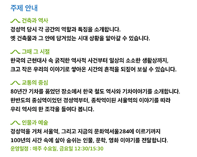 내부투어는 '교통의 중심(교통) / 건축과 역사(건축) / 그때 그 시절(생활상) / 인물과 예술(예술)' 4가지 주제로 이루어져 있습니다.