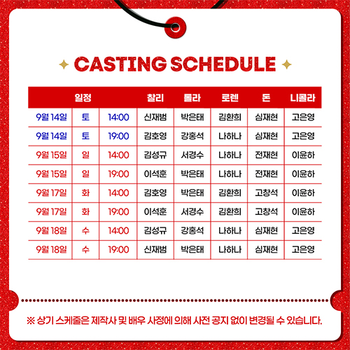 * 롤라역 최재림 배우와 로렌역 김지우 배우는 10월 공연부터 합류 예정입니다.