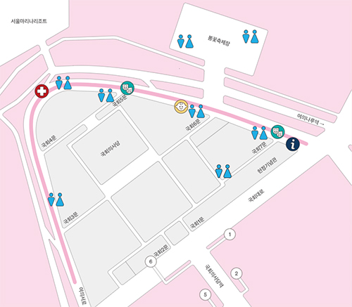 - 화장실 : 곳곳에 배치되어있습니다. (하늘색 아이콘=화장실)