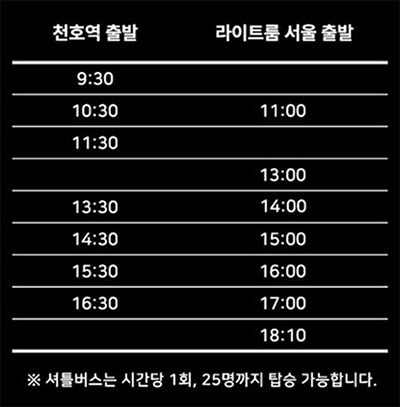 9:30 ~ 16:30 / 한 시간 간격으로 운행 (12:30 미운행)