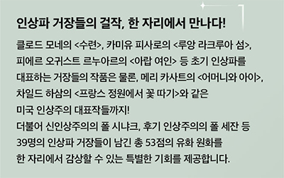 세계적인 미술사의 흐름을 조명하는 이번 전시를 통해 인상파 작품들이 선사하는 빛과 색의 향연을 경험해 보세요.