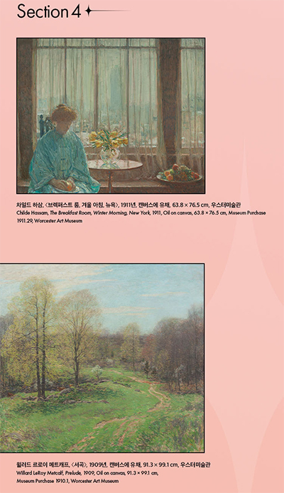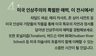 미국 인상파 거장들의 작품을 통해 미국 특유의 자연과 정서를 담아낸 인상주의의 매력을 감상해 보세요!