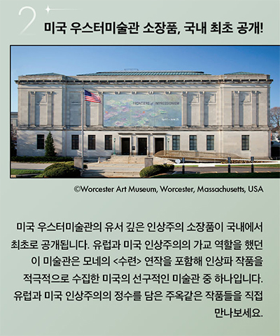 모네의 <수련> 연작을 포함해 인상파 작품을 적극적으로 수집한 미국 우스터 미술관의 유서 깊은 인상주의 소장품이 국내에 최초로 공개됩니다.
