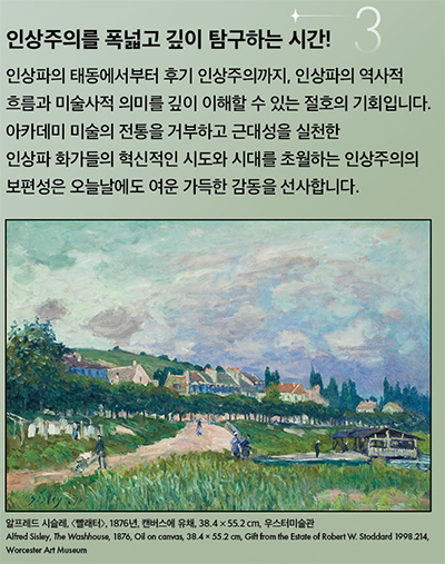 이번 전시는 국내 최초로 공개되는 미국 우스터미술관의 엄선된 인상파 유화 원화 53점을 통해, 프랑스에서 시작된 인상주의가 유럽과 미국으로 확산되며 미술사에 끼친 영향을 탐구합니다.